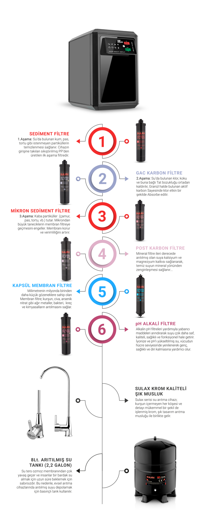 Sulax Dijital Ekranlı Su Arıtma Cihazı, suyunuzdaki tüm kirleticileri 6 aşamalı filtreleme sistemiyle temizler. İşte her bir aşama: